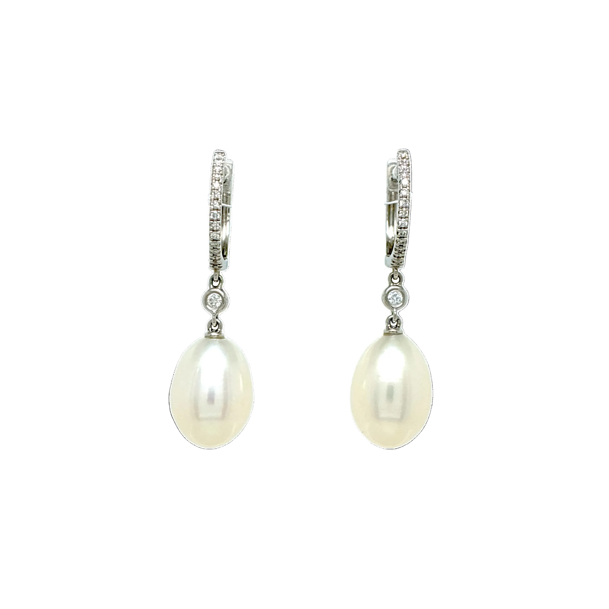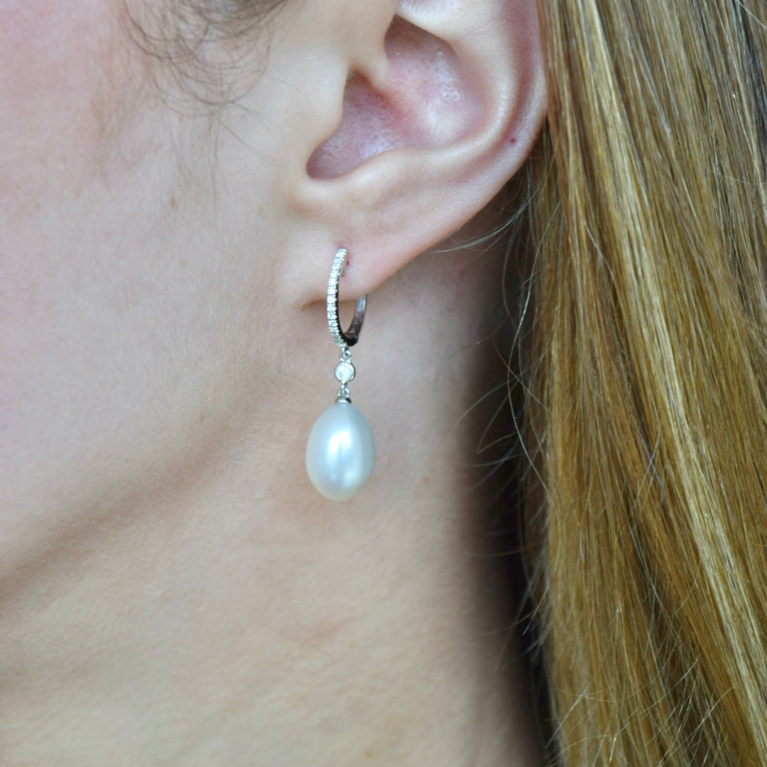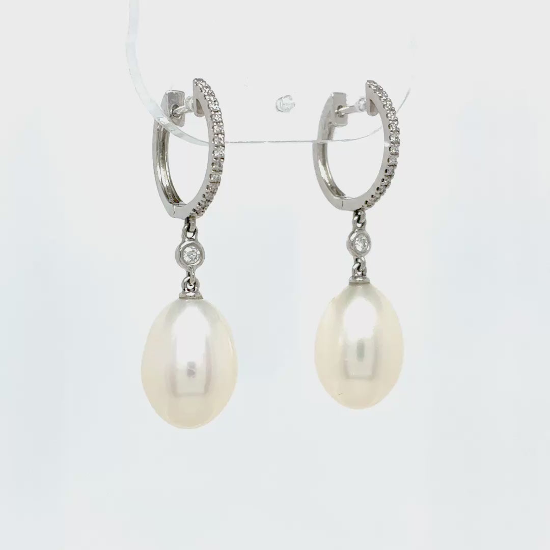 Aros de oro blanco 18k, 0.16ct en diamantes y perlas ovales de 9.5mm.