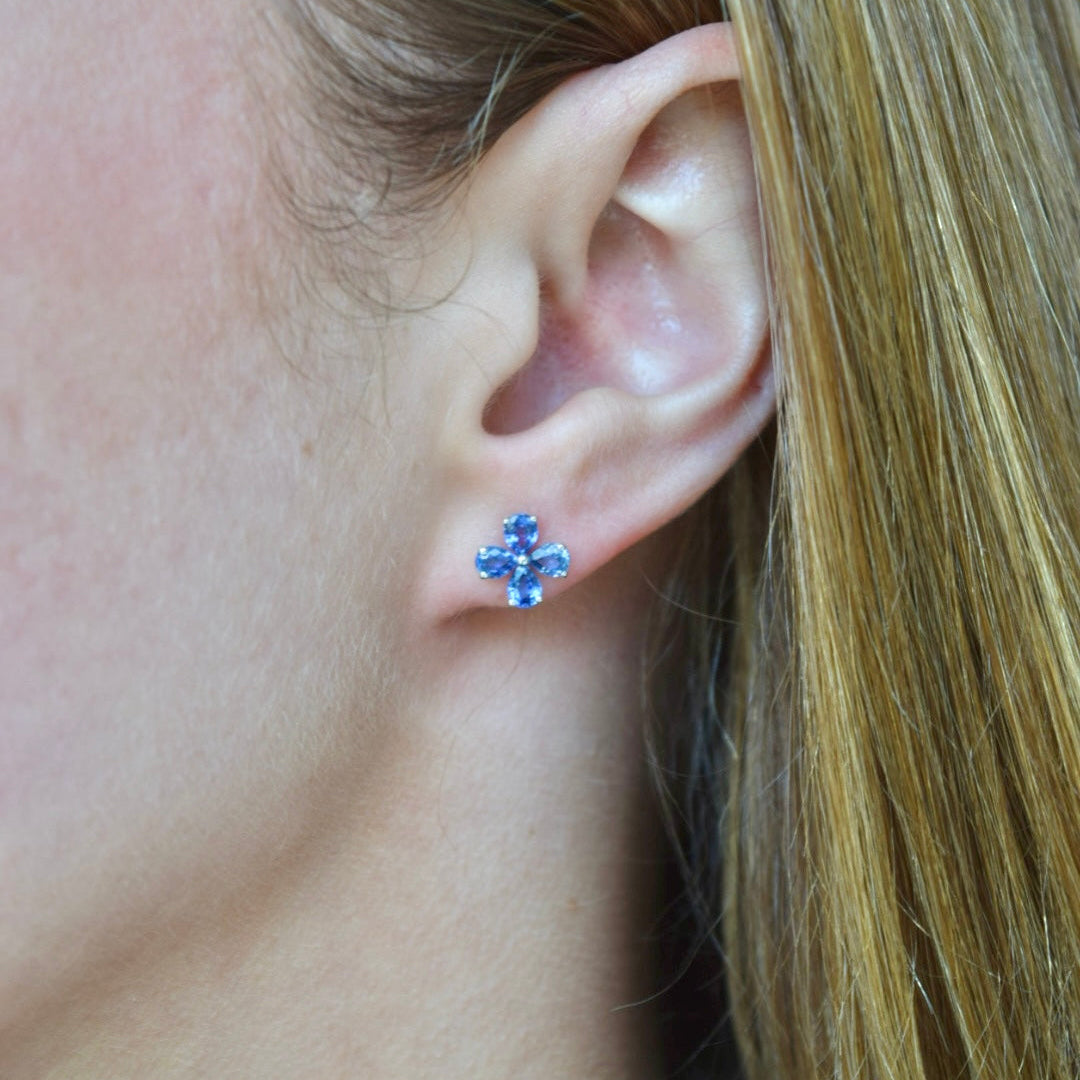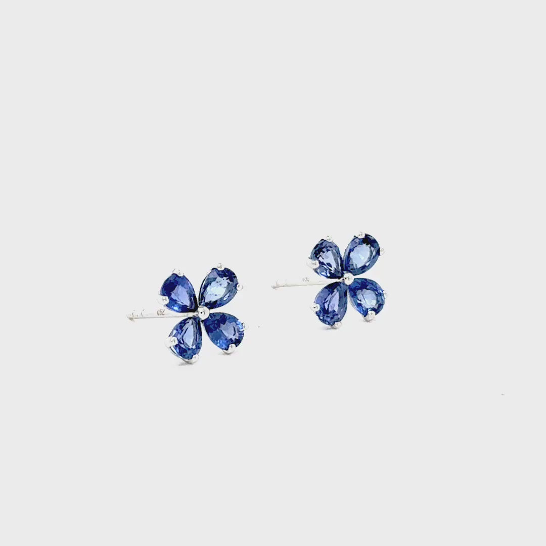 Aros flor de oro blanco 18k y 1.43ct en zafiros azules corte gota.