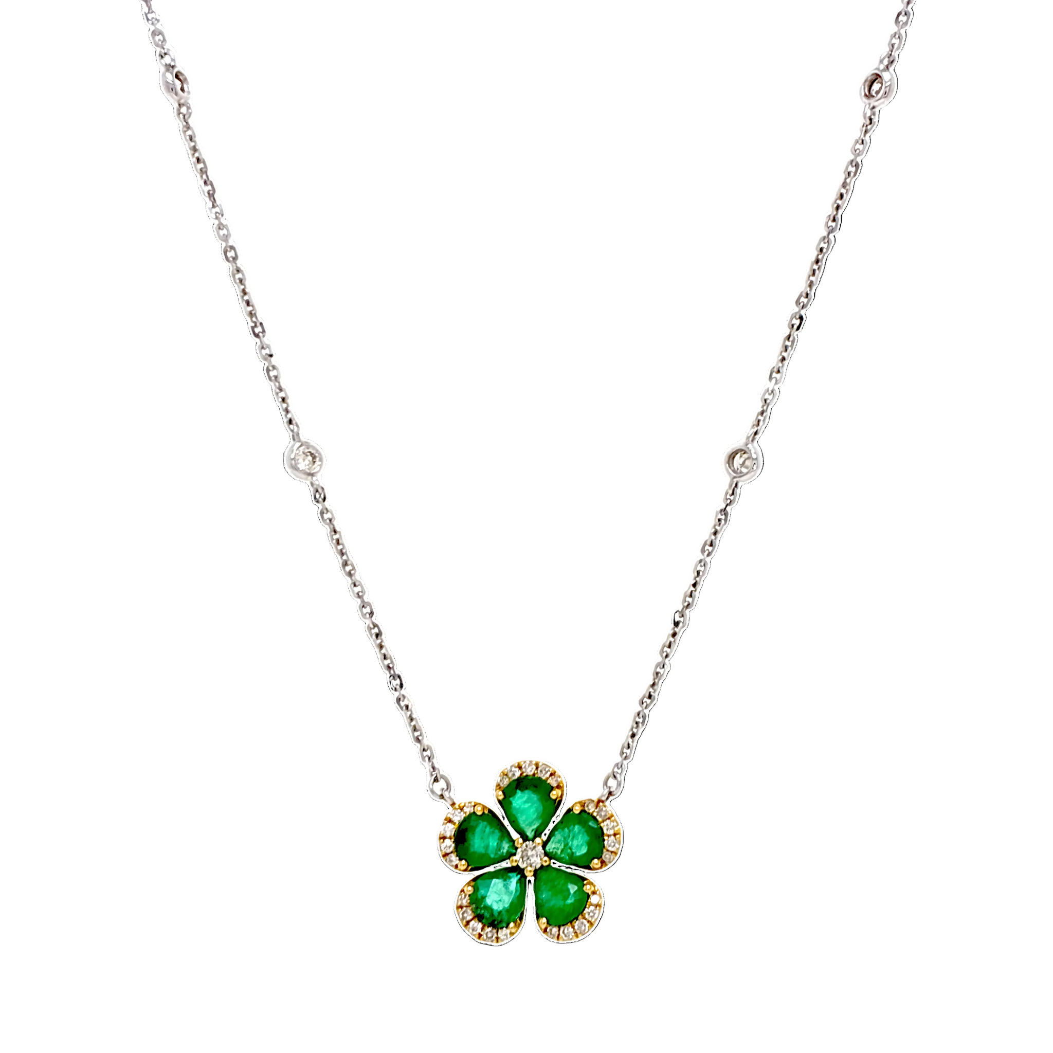 Collar de oro blanco 18k, 0.26ct en diamantes y 1.44ct en esmeraldas corte gota engastadas en oro amarillo 18k.
