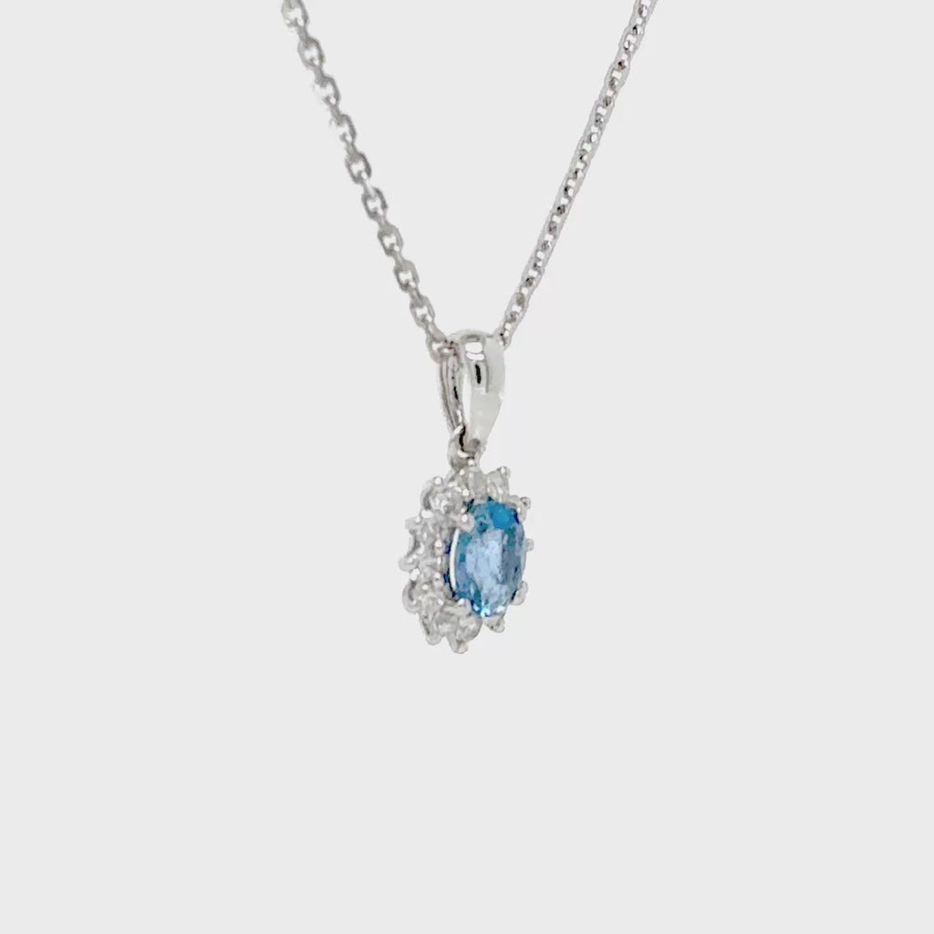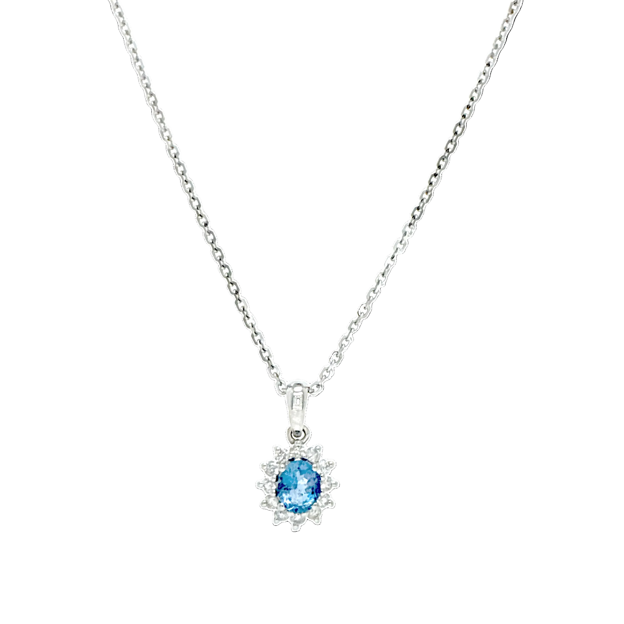 Collar de oro blanco 18k, aguamarina central de 0.30ct y 0.16ct en diamantes.