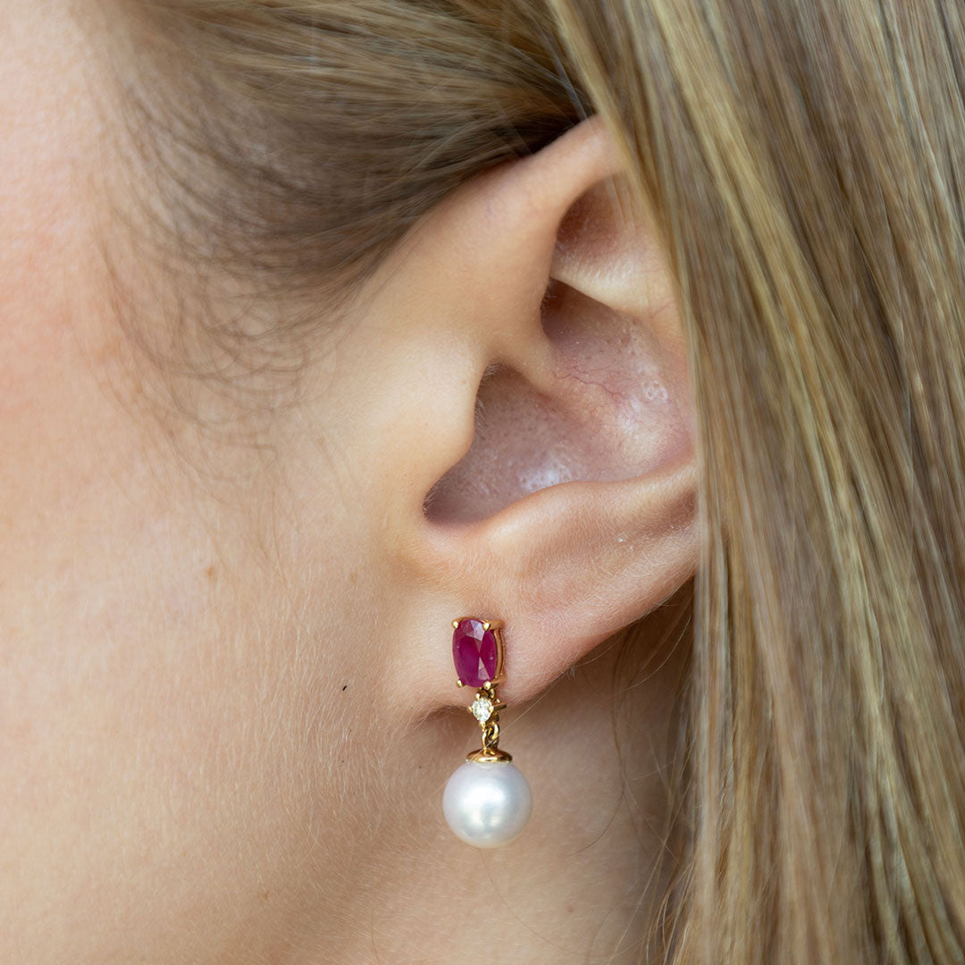 Aros de oro amarillo 18k, 1.45ct en rubíes, 0.07ct en diamantes y perlas Akoya.
